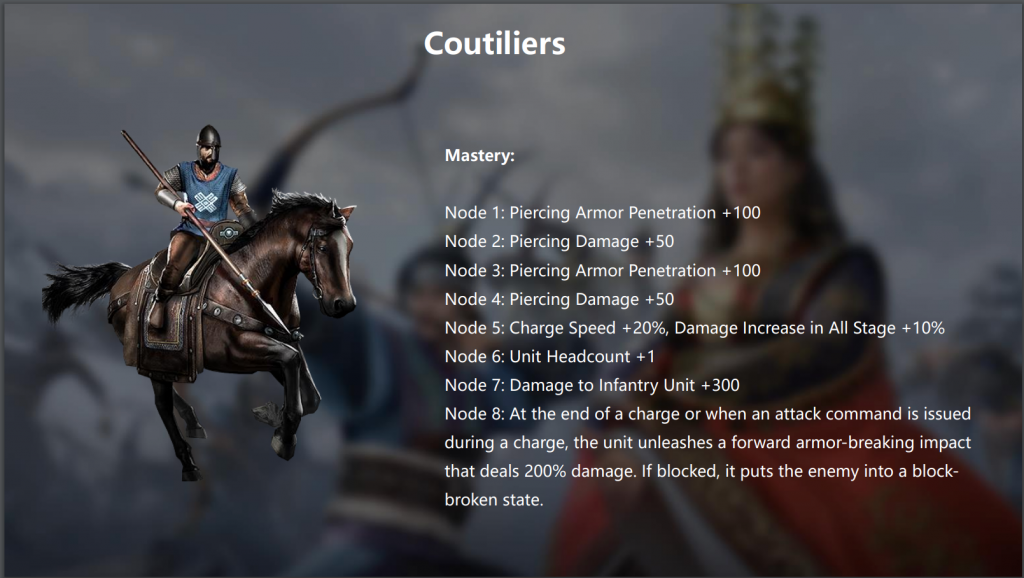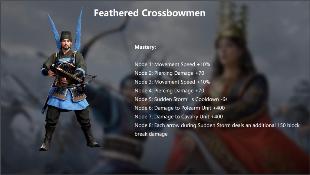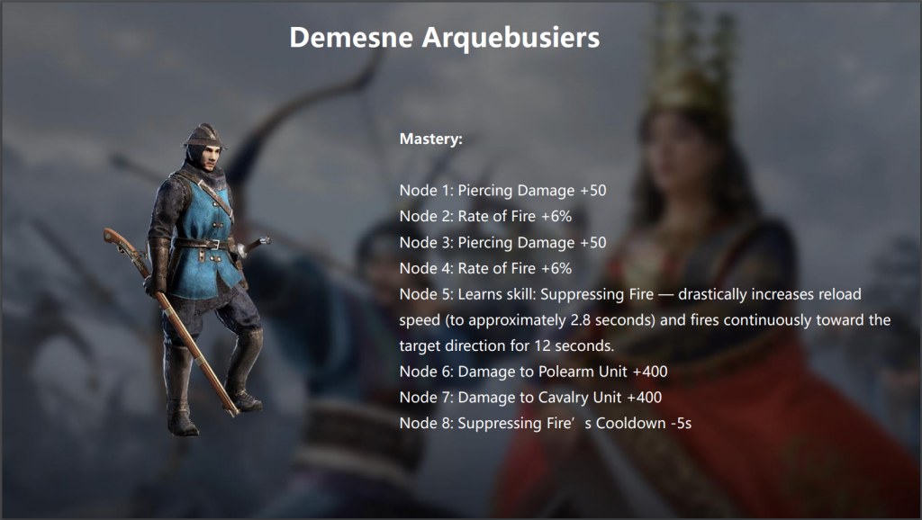 Summary Demesne Crossbowmen are a tier‑2 Chivalric Era ranged infantry unit armed with heavy crossbows, delivering high piercing damage per shot (and has high shooting rate) but lacking coordinated volley fire. Unit Overview Abilities & Orders Strengths & Weaknesses Strengths: Weaknesses: Tactics & Tips Warband Synergy & Composition Counters & Mitigation Quick-Reference Card